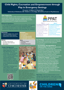 Laxton, D. (2025) Child rights, cocreation and empowerment: a pilot project to explore the effectiveness of a play provision assessment tool in Kyaka II refugee settlement, Uganda and playgroups across Botswana. In: 33rd EECERA Annual Conference - Early Educations for All: Celebrating Diversity and Seeking Inclusion, 25th - 28th August 2025, Comenius University, Bratislava, Slovakia. (Unpublished)