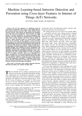 Hafsa, N., Alzoubi, H. and Imran, S. (2025) Machine learning-based intrusion detection and prevention using cross-layer features in Internet of Things (IoT) networks. Journal of Communications and Networks. pp. 1-14. ISSN 1976-5541