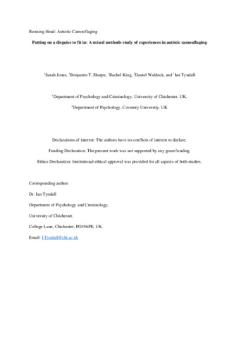 Jones, S., Sharpe, B. T., King, R., Waldeck, D. and Tyndall, I. (2025) Putting on a disguise to fit in: A mixed methods study of experiences in autistic camouflaging. Research in Neurodiversity, 1. pp. 1-11. ISSN 3050-5798
