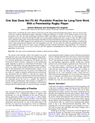 McKenzie, G., Wagstaff, C. R. D., Wadey, R. and McDougall, M. (2025) One size does not fit all: pluralistic practice for long-term work with a premiership rugby player. Case Studies in Sport and Performance Psychology, 9 (1). pp. 1-8. ISSN 3068-0530