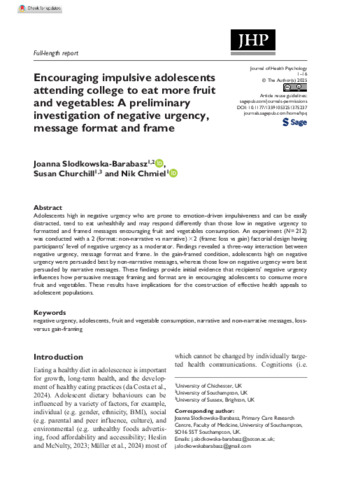 Slodkowska-Barabasz, J., Churchill, S. and Chmiel, N. (2025) Encouraging impulsive adolescents attending college to eat more fruit and vegetables: a preliminary investigation of negative urgency, message format and frame. Journal of Health Psychology. pp. 1-16. ISSN 1461-7277