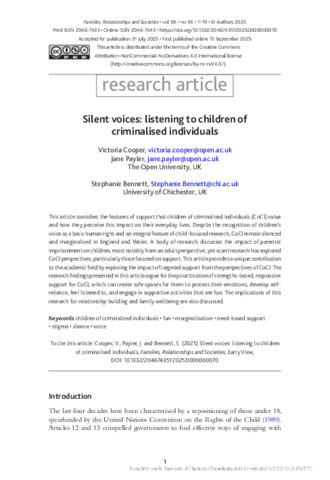 Cooper, V., Payler, J. and Bennett, S. J. (2025) Silent voices: listening to children of criminalised individuals. Families, Relationships and Societies. pp. 1-19. ISSN 2046-7443