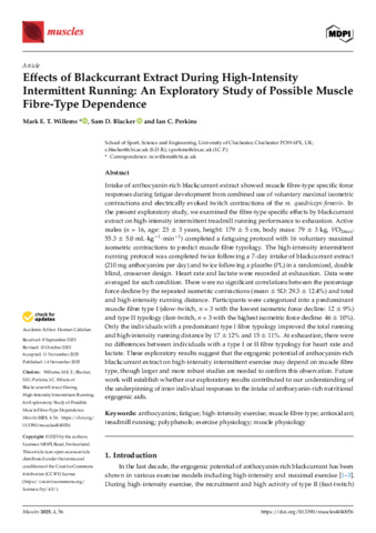 Willems, M. E. T., Blacker, S. D. and Perkins, I. (2025) Effects of blackcurrant extract during high-intensity intermittent running: an exploratory study of possible muscle fibre-type dependence. Muscles, 4 (4). pp. 1-11. ISSN 2813-0413
