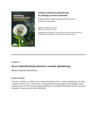 Chubb, S. and Hebron, C. (2025) Art as a deterritorialising vehicle for a nomadic physiotherapy. In: Inviting movements in physiotherapy: An anthology of critical scholarship. University of Manitoba Libraries, Winnipeg, pp. 214-239. ISBN 978-1-987830-17-0 (ebook) 978-1-987830-18-7 (PDF)