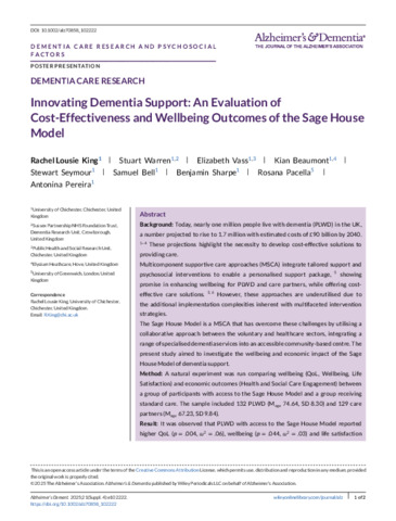 King, R., Warren, S., Vass, E., Beaumont, K., Seymour, S., Bell, S., Sharpe, B. T., Pacella, R. E. and Pereira, A. (2025) Innovating dementia support: an evaluation of cost‐effectiveness and wellbeing outcomes of the Sage House Model. Alzheimer's & Dementia, 21 (S4). p. 1. ISSN 1552-5279