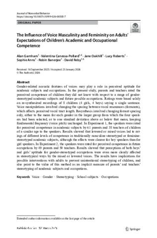 Canessa-Pollard, V., Oakhill, J., Garnham, A., Roberts, L., Anns, S. and Reby, D. (2026) The influence of voice masculinity and femininity on parents' and teachers' expectations of children’s academic and occupational competence. Journal of Nonverbal Behavior. pp. 1-15. ISSN 0191-5886