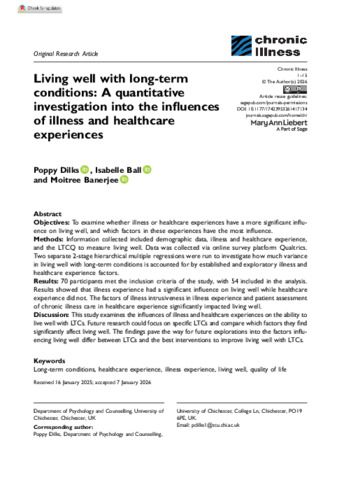 Dilks, P., Ball, I. and Banerjee, M. (2026) Living well with long-term conditions: a quantitative investigation into the influences of illness and healthcare experiences. Chronic Illness. pp. 1-15. ISSN 1745-9206