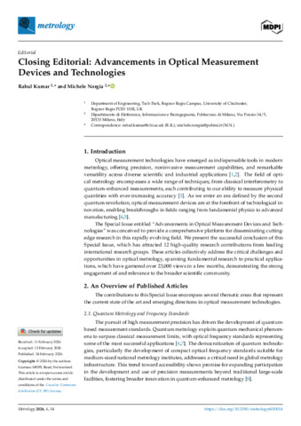 Kumar, R. and Norgia, M. (2026) Closing editorial: advancements in optical measurement devices and technologies. Metrology, 6 (1). pp. 1-5. ISSN 2673-8244