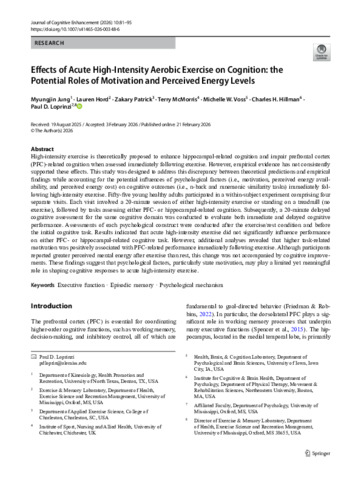 Jung, M., Hord, L., Patrick, Z., McMorris, T., Voss, M. W., Hillman, C. H. and Loprinzi, P. D. (2026) Effects of acute high-intensity aerobic exercise on cognition: the potential roles of motivation and perceived energy levels. Journal of Cognitive Enhancement, 10 (1). pp. 81-95. ISSN 2509-3304